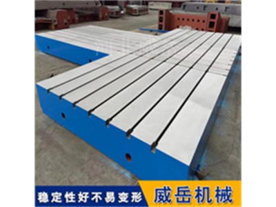 铸铁T型槽平台在浇注完成后开始用振动清沙和人工除沙并清理铸铁平台毛坯周围的废弃物,清沙完哔后铸件自然放凉并开始第一次回火(时效处理),铸件在回火窑升温至780°并在窑种和窑的温度同时降至50°方可出窑。铸铁平台的铸件在粗加工的时候使用的是济南产龙门刨床和断面铣床使铸铁平台四周及上下面成正方形或是长方形,如果需要开T型槽须在刨完平面后放置一天后才能开T型槽或是U型槽、矩型槽等加工。如果在铸铁平台上进行钻孔或是绞螺纹孔也可以用数控龙门铣床进行一次性完成,精度高,光洁度高。