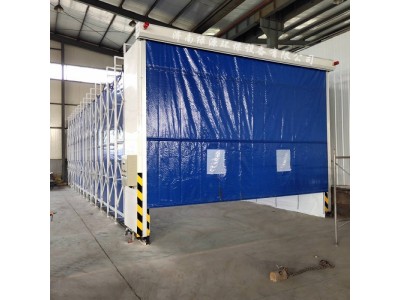 移动伸缩前室由钢架结构和阻燃PVC布组成,通过平行四边形连杆机构或轨道驱动系统实现自动展开与合拢。工作时,前室沿轨道平滑移动至工件上方,形成封闭/半封闭空间进行喷漆;完成后收缩至一侧,节省空间并实现多工序共用场地。其核心系统包括: