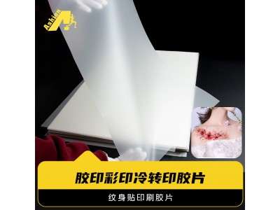 使用流程:将纹身标用的油墨直接印在纹身感压胶片上,再将纹身AB胶丝印,最后将隔离纸进行隔离,分切成片,贴于皮肤,完成