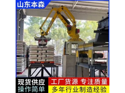 袋装硅酸盐全自动本森关节码垛机器人是一种专为袋装物料(如硅酸盐、生物饲料、化工产品等)自动化码垛设计的工业机器人系统,以下从定义、原理、优势、应用场景四个方面进行介绍: