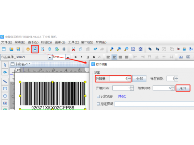 3. 点击软件顶部的“打印”按钮,在打开的打印设置窗口中设置数据量(标签的总个数),开始页码为1,点击结束页码后面的“尾页”,打印到切换到“打印机”,点击下面的“打印”按钮,软件中会出现一个输入提示框,用扫描枪将已有的二维码内容扫描进去之后,打印机中就会即时打印出来一个条形码,直到最后一个二维码扫描完成之后,输入提示框就自动消失了。