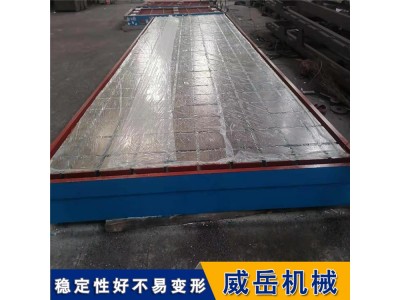 铸铁T型槽平台在浇注完成后开始用振动清沙和人工除沙并清理铸铁平台毛坯周围的废弃物,清沙完哔后铸件自然放凉并开始第一次回火(时效处理),铸件在回火窑升温至780°并在窑种和窑的温度同时降至50°方可出窑。铸铁平台的铸件在粗加工的时候使用的是济南产龙门刨床和断面铣床使铸铁平台四周及上下面成正方形或是长方形,如果需要开T型槽须在刨完平面后放置一天后才能开T型槽或是U型槽、矩型槽等加工。如果在铸铁平台上进行钻孔或是绞螺纹孔也可以用数控龙门铣床进行一次性完成,精度高,光洁度高。